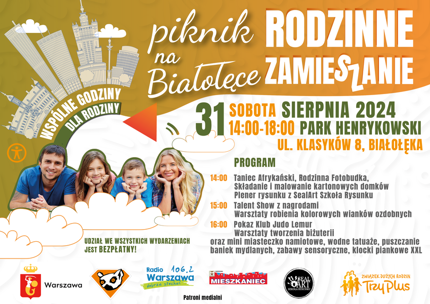 Zapraszamy warszawskie rodziny w sobotę 31 sierpnia 2024 od godz.14:00 do wspólnego spędzania czasu w bardzo atrakcyjnym Parku Henrykowskim na warszawskiej Białołęce