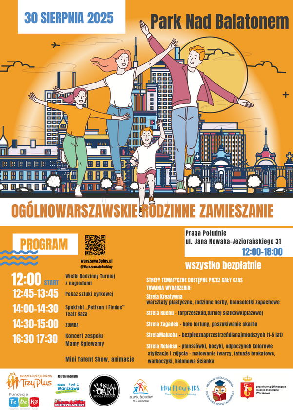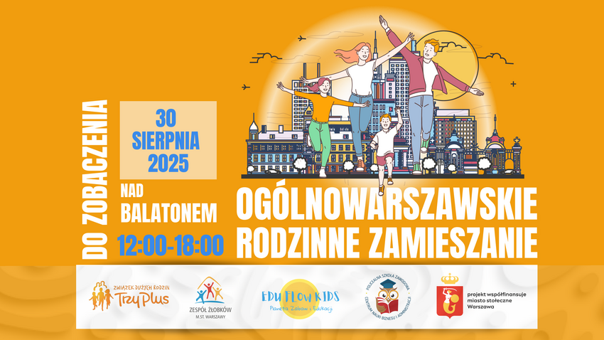 Tekst alternatywny/grafika: na pomarańczowym tle zarys charakterystycznych budowli Warszawy, przed którym przedstawiono rodzinę. Powtórzono informacje organizacyjne.