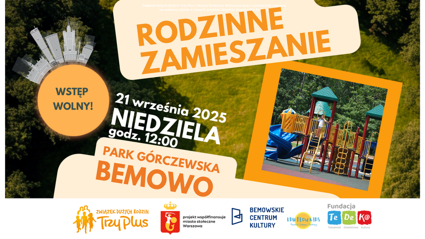 Związek Dużych Rodzin Trzy Plus i Miasto Stołeczne Warszawa wraz z partnerami zaprasza na rodzinny piknik w ramach projektu Wspólne Godziny Dla Rodziny. Wydarzenie dla warszawskich rodzin z dziećmi pełne ruchu, śmiechu i wspólnej zabawy.